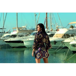 Výrazný a výrazný vzor, tmavší barvy a satén - kombinace, která vzbuzuje zájem. Tuto spodní sukni si můžete obléknout, kdykoli budete mít chuť si odpočinout a uvolnit se. 3/4 rukávy, zavazování v pase, délka do poloviny stehen. Takže ranní káva nebo večer s dobrou knihou? - v tomto plášti můžete dělat obojí. Složení: 100% polyester.
