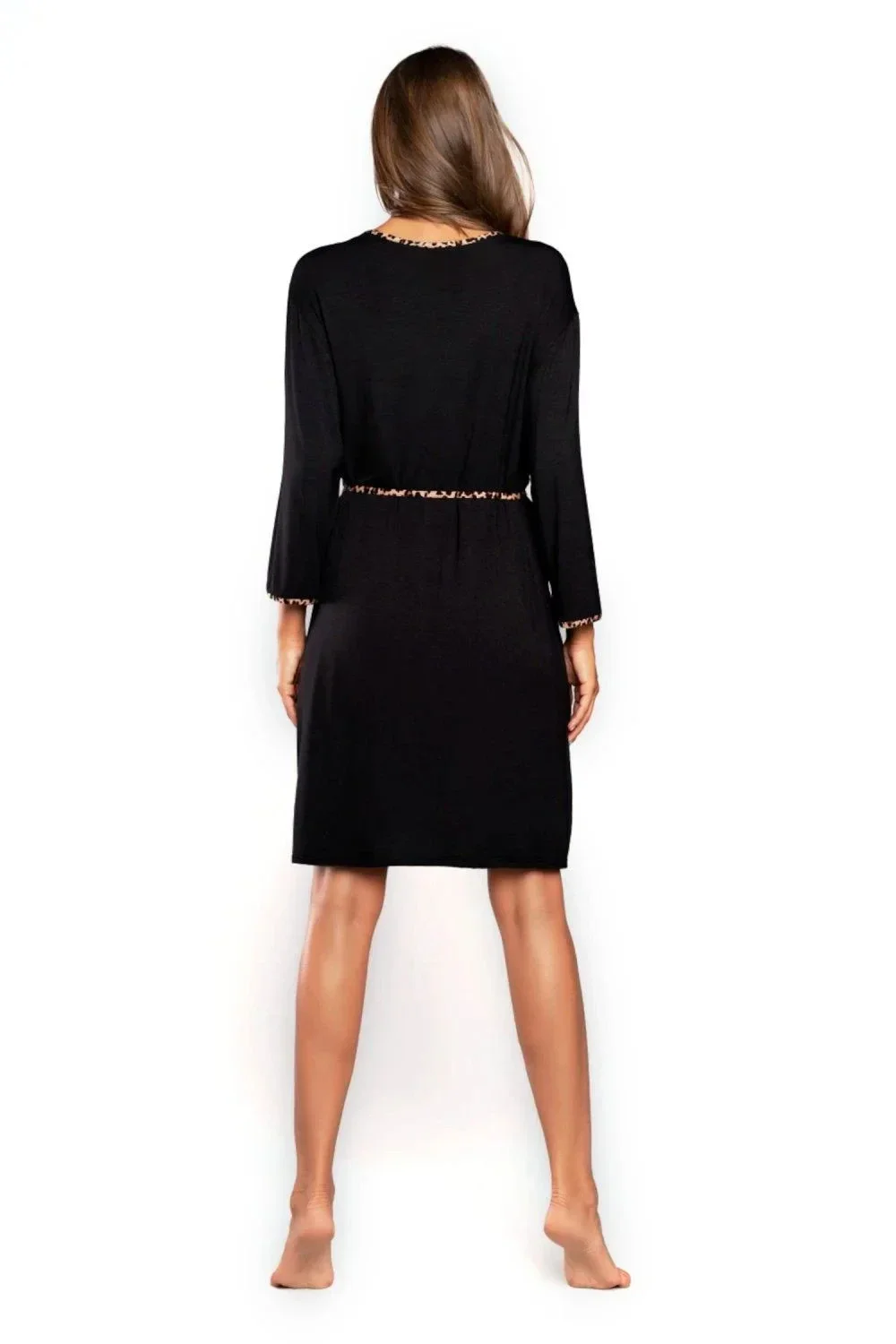 Dámsky župan Eila ITALIAN FASHION - čierna farba - vyrobený z veľmi kvalitného materiálu - s dlhými rukávmi - zaväzovanie na opasok - lemy v leoparďom vzore - na bokoch sú vrecká - dĺžka nad kolenáMateriálové zloženie: 90% viskóza + 10% spandex