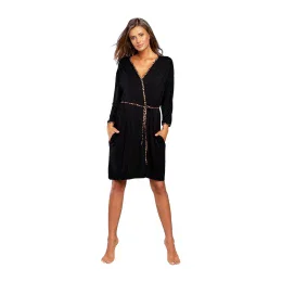 Dámsky župan Eila ITALIAN FASHION - čierna farba - vyrobený z veľmi kvalitného materiálu - s dlhými rukávmi - zaväzovanie na opasok - lemy v leoparďom vzore - na bokoch sú vrecká - dĺžka nad kolená