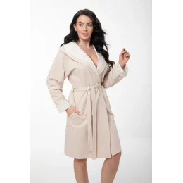 Štýlový a pohodlný dámsky župan Dorota FR-388 je dokonalou kombináciou elegancie a pohodlia. Je vyrobený zo 100 % bavlneného úpletu, je mäkký, priedušný a príjemný na dotyk. Zaväzovanie v páse zvýrazňuje siluetu, zatiaľ čo kapucňa a vzorované látkové manžety dodávajú jedinečný nádych. Je ideálny na chladnejšie večery, rána a ako elegantný domáci plášť a je k dispozícii v dvoch farbách, ktoré sa prispôsobia vášmu štýlu!