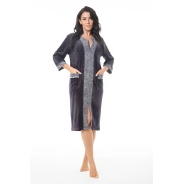 Dámsky župan FR-404 značky Dorota je kombináciou štýlu, pohodlia a funkčnosti, vytvorený pre ženy, ktoré oceňujú pohodlie a eleganciu v domácom štýle. Je vyrobený z bavlny príjemnej na dotyk s polyesterom, poskytuje primeranú vzdušnosť a mäkkosť, ideálny na chladné rána a večery. Zips zaručuje rýchle a pohodlné obliekanie a vďaka 3/4 rukávom a dĺžke po kolená je model vhodný na celý rok. Ďalšou výhodou sú praktické vrecká na úrovni bokov. Župan FR-404 je nenahraditeľnou súčasťou domáceho šatníka, spája pohodlie so ženským štýlom.