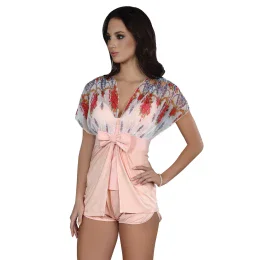 Dámsky župan Imperia Livco - z pestrofarebného hladkého príjemného materiálu na dotyk - horná časť z pokrčeného tylu kvetinové vzoru - ozdobený veľkou ružovou mašľou - dve očká na zapínanie - krátke rukávy