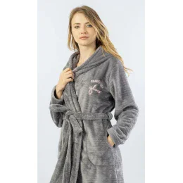 Dámsky krátky mäkký župan s kapucňou Monika. Hrejivý župan v príjemnej sivej farbe má praktické vrecká, sťahovací pás a kapucňu. Na prednej strane je malý anglický nápis v ružovej farbe, ktorý doslova znamená "Ready to shine" (Pripravený žiariť). Použitý mäkký materiál je jemný a poddajný na dotyk.