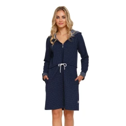 Dámský župan 5241 blue Doctornap - tmavě modrá barva - s bílými puntíky - vyrobený z velmi kvalitní a příjemné bavlny - dlouhé rukávy - vázání v pase - s kapucí - manžety a kapuce zdobené proužky - délka nad kolena - certifikát OEKO-TEX Standard 100Materiálové složení: 95% bavlna + 5% polyester