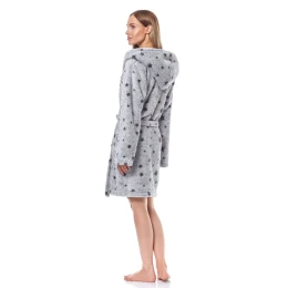 Dámský krátký župan 9135 L&L - ušitý z měkkého materiálu typu soft - šedá barva s grafitovými hvězdičkami - má kapsy a v pase vázání - s kapucí