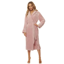 Dámský dlouhý župan 2084 L&L - velmi měkký a příjemný materiál na dotek - ozdobený saténovým prošitím - béžovo růžová barva - na bocích našité kapsy - šálový límec - zavazování na pásek