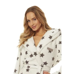 Dámský župan 9135 white L&L - bílá barva - ušitý z měkkého materiálu typu soft - s tmavě šedými hvězdičkami - má kapsy a v pase vázání - s kapucí