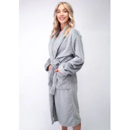Dámský župan značky Lingadore. Župan je dlouhý pod kolena, okolo krku má límec a rukávy jsou ukončené ohrnutou manžetou. Na stranách jsou našité kapsy. Župan lze okolo pasu uvázat páskem, který drží na přišitých poutkách. Celý župan má perforovaný vzhled a je velmi příjemný na dotek.