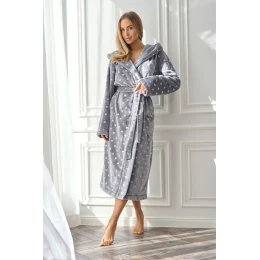 Szlafrok damski 2551 to wyjątkowe połączenie wygody, ciepła i subtelnego uroku. Wykonany z miękkiej dzianiny ozdobionej delikatnymi, połyskującymi serduszkami, zachwyca swoim kobiecym charakterem. Długi fason z praktycznym kapturem oraz długimi rękawami doskonale sprawdzi się w chłodniejsze dni. Wiązanie w pasie pozwala na idealne dopasowanie do sylwetki, a wygodne kieszenie na biodrach zapewniają dodatkowy komfort. To doskonały wybór na wieczorny relaks, poranne rytuały czy jako elegancki prezent.