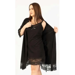 Dámský župan s noční košilí na ramínka Laura. Komplet skládající se z krásné noční košilky na špagetová ramínka, která má výstřih a spodní lem ozdobený širokou krajkou, a ze župánku, který má zas stejnou krajkou ozdobené rukávy a také spodní lem. K županu náleží pásek ke stažení. Požitý materiál je jemný a poddajný na dotek. Komplet je vhodný na denní nošení.