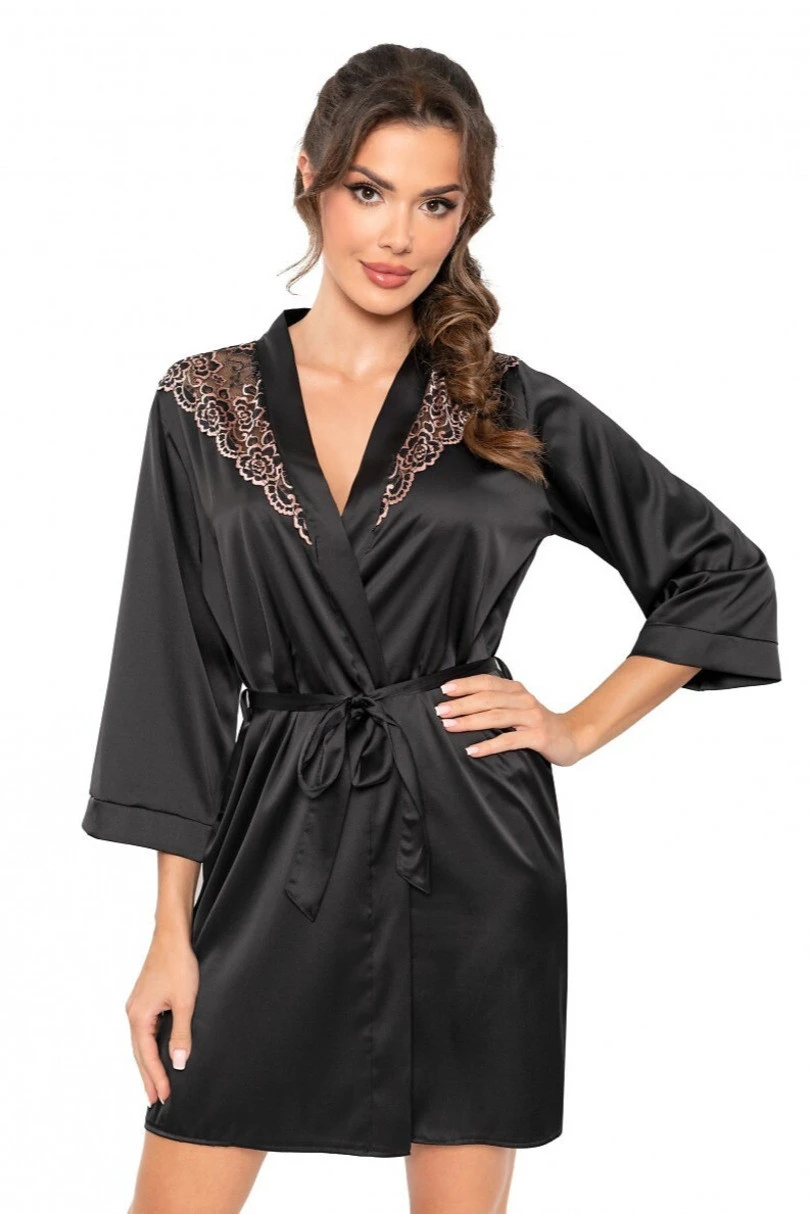 Podkreśl swoją kobiecość i elegancję dzięki satynowemu peniuarowi, który łączy luksusowy wygląd z wyjątkowym komfortem. Model wykonano z miękkiej, delikatnie połyskującej satyny, która doskonale układa się na sylwetce. Rękaw o długości 7/8 zapewnia swobodę ruchów i lekkość, idealną na wieczorny relaks czy poranne rytuały. Ramiona zdobi efektowna koronka z kwiatowym motywem, dodając szlafrokowi zmysłowego charakteru i eleganckiego wykończenia. Wiązanie w pasie pozwala dopasować peniuar do figury, podkreślając talię i nadając całości stylowego wyglądu. Doskonale komponuje się z piżamą lub koszulką z tej samej linii — tworząc spójny, luksusowy komplet, który zachwyca na każdym kroku.