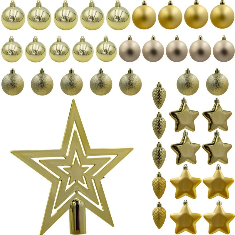 - súprava obsahuje 40 ozdôb rovnakej farby a rôznych štruktúr, ako aj hviezdicovú špičku