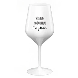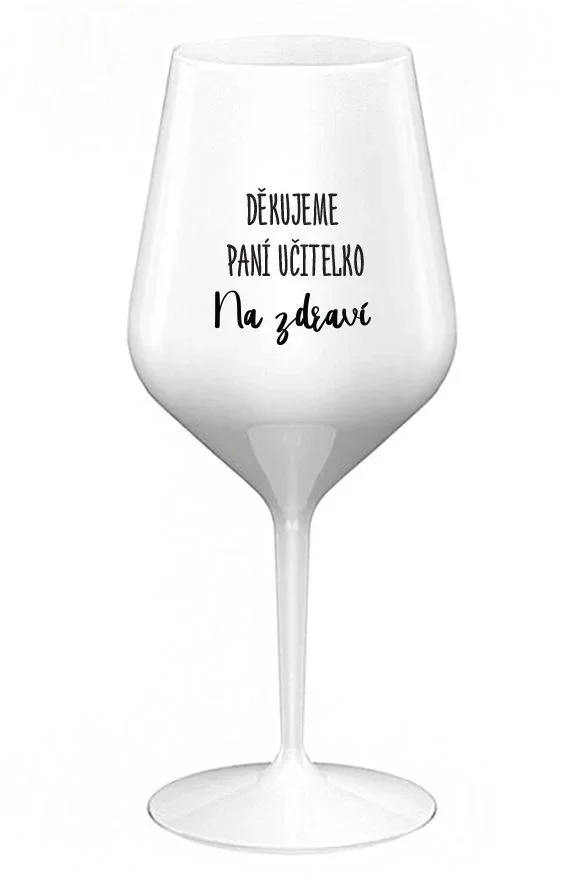 DĚKUJEME PANÍ UČITELKO - NA ZDRAVÍ - bílá nerozbitná sklenice na víno 470 ml