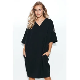 Ležérne mikinové šaty nadmernej veľkosti, ktoré sú ideálne na víkendové popoludnia a predĺžený deň v práci. Je to typ šiat, ktoré môžete nosiť na mnoho spôsobov a zakaždým budú vyzerať úplne inak. Šaty sú jednoduché, a preto využívajú mnoho zaujímavých ozdobných prvkov. Majú geometrický strih a na chrbte sú mierne rozšírené, aby sa ľahko používali. Na jednom z rukávov je ozdobná aplikácia. Sladký výstrih zaisťuje, že silueta v šatách nevyzerá ťažko.