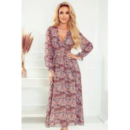 Šifónové midi šaty s hlbokým výstrihom a dlhými rukávmi. Šaty zo vzorovaného materiálu. Vyrobené v Poľsku. Značka Numoco.