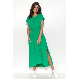 Tieto dlhé asymetrické šaty sú vyrobené z pletenej potnej látky. Majú okrúhly výstrih a šnúrku v páse. Zadná časť šiat je o niečo dlhšia ako predná, vďaka čomu ležérna kreácia pôsobí na siluete zaujímavo. Takmer po celej dĺžke majú šaty jemné nariasenie. Na bokoch sú bočné našité vrecká. Okrúhly výstrih necháva priestor na krásnu retiazku. Krátke rukávy zasa maskujú ramienka spodnej bielizne. Oblečte si ich s obľúbenými topánkami alebo sandálmi a užite si ležérny, ale elegantný vzhľad.