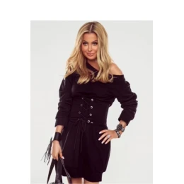 Čierne teplákové šaty so širokým opaskom. Šaty sú vyrobené z mäkkej teplákovej tkaniny a majú ležérny strih z kolekcie By o la la. Model má široký lodičkový výstrih a dlhé rukávy s manžetami. Šaty majú pútavý široký šnurovací opasok so zapínaním na zips a háčik. Opasok dodáva šatám jedinečný charakter.