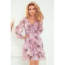 Šifónové šaty s elastickým pásom a rukávmi. Výstrih, ktorý sa dá ľubovoľne zaviazať, im dodáva šarm. Vzorované ružovými kvetmi na pastelovom pozadí. Vyrobené zo šifónu príjemného na dotyk s podšívkou (95 % polyester, 5 % elastan). Značka numoco. Vyrobené v Poľsku.