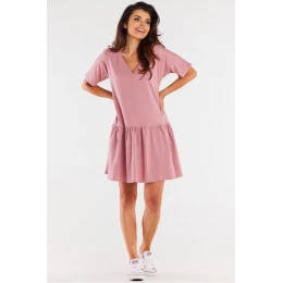 Šaty v ležérnom štýle s krátkymi rukávmi a volánom v spodnej časti. Vďaka voľnému strihu sa pohodlne nosia počas teplých dní a krásne farby sú ideálne pre každý odtieň pleti a typ krásy, čo zaručuje dokonalý vzhľad v každej situácii. Perfektné s letnými sandálmi a teniskami. Navrhnuté a ušité v Poľsku.