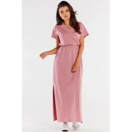 Maxi šaty s krátkymi rukávmi a srdiečkovým výstrihom. Maxi dĺžka umožňuje opticky zoštíhliť siluetu a zvýrazniť prednosti. Navrhnuté a ušité v Poľsku.