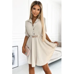 Košeľové šaty s golierom, gombíkmi a zlatým opaskom. Sukňa je na bokoch skrátená, aby opticky predĺžila nohy. Vyrobené z béžovej krepovej tkaniny. Ideálne šaty na akúkoľvek príležitosť. Značka numoco. Európska výroba.