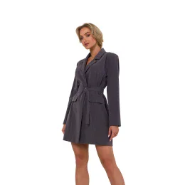 Sako s golierom a dlhými rukávmi. Šaty sú zapínané na kryté gombíky, bez podšívky. Doplnené opaskom z rovnakého materiálu ako šaty.