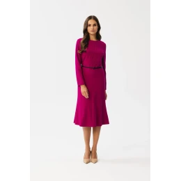 Tieto šaty vynikajú ozdobným prešívaním pri výstrihu, ktoré im dodáva šarm. Rozparok v páse zvýrazňuje pás a priložený opasok z umelej kože je štýlovým doplnkom. Dlhé rovné rukávy sú univerzálne a módne. Spodná časť šiat je strihaná so šikmým lemom s prešívaním v strede pre ľahký vzhľad. Vďaka dĺžke pod kolená sú šaty vhodné na mnohé príležitosti. Krytý zips na zadnej strane uľahčuje obliekanie. Šaty sú bez podšívky pre pohodlné nosenie. Tieto šaty boli navrhnuté a ušité v Poľsku, čo svedčí o ich kvalite a jedinečnosti. Dodajú vám sebavedomie a štýl na rôzne príležitosti.