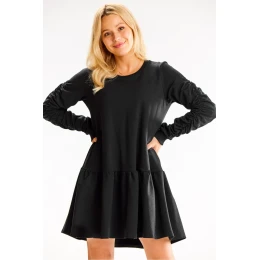 Voľné šaty s dlhými rukávmi, okrúhlym výstrihom a nariaseným lemom. Rukávy s ozdobnými záhybmi.