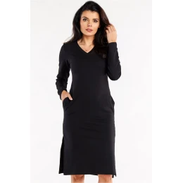 Priliehavé šaty s dlhými rukávmi a rázporkami na bokoch. Šaty majú véčkový výstrih a ozdobné našité vrecká.