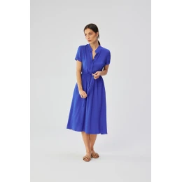 Tyto šaty z vysoce kvalitní viskózové tkaniny, vyrobené výhradně v Polsku, jsou kombinací elegance, pohodlí a místního řemeslného umění. Tkanina ze 100% viskózy zaručuje měkkost, jemnost a potěšení z nošení a zároveň vytváří mírně rozšířený střih šatů. V pase mají šaty stahovací šňůrku, která jemně zvýrazní ženské křivky a přizpůsobí je individuálním preferencím. Horní část šatů se rozepíná, což usnadňuje jejich oblékání a svlékání a dodává jim prvek praktičnosti. Pod krkem je stojáček, který šatům dodává sofistikovaný nádech. Krátké rukávy s mírným ohrnutím dodávají šatům lehký a svěží nádech a dokonale se hodí k letním stylům. Za zmínku stojí, že šaty nemají žádnou podšívku, díky čemuž látka dokonale přiléhá k tělu a zároveň zůstává lehká a vzdušná. Navrhování a šití v Polsku klade důraz na místní výrobu, což je další výhoda pro uvědomělé spotřebitele, kteří oceňuj