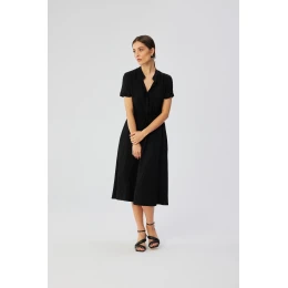 Tyto šaty z vysoce kvalitní viskózové tkaniny, vyrobené výhradně v Polsku, jsou kombinací elegance, pohodlí a místního řemeslného umění. Tkanina ze 100% viskózy zaručuje měkkost, jemnost a potěšení z nošení a zároveň vytváří mírně rozšířený střih šatů. V pase mají šaty stahovací šňůrku, která jemně zvýrazní ženské křivky a přizpůsobí je individuálním preferencím. Horní část šatů se rozepíná, což usnadňuje jejich oblékání a svlékání a dodává jim prvek praktičnosti. Pod krkem je stojáček, který šatům dodává sofistikovaný nádech. Krátké rukávy s mírným ohrnutím dodávají šatům lehký a svěží nádech a dokonale se hodí k letním stylům. Za zmínku stojí, že šaty nemají žádnou podšívku, díky čemuž látka dokonale přiléhá k tělu a zároveň zůstává lehká a vzdušná. Navrhování a šití v Polsku klade důraz na místní výrobu, což je další výhoda pro uvědomělé spotřebitele, kteří oceňuj