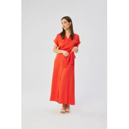 Tyto šaty na knoflíky, vytvořené z vysoce kvalitní 100% viskózy, jsou výjimečným kouskem oděvu, hrdě navrženým a ušitým v Polsku. Tyto maxi šaty vyzařují eleganci a pohodlí a vytvářejí harmonii mezi stylem a funkčností. Střih šatů s mírně rozšířeným průstřihem poskytuje volnost pohybu a zároveň je ideální pro různé příležitosti. Límec dodává šatům elegantní a šik nádech a celkovému vzhledu propůjčuje sofistikovaný nádech. Krátké kimonové rukávy dodávají stylingu lehkost a svěžest. Šaty se vpředu zapínají na knoflíky, což nejen usnadňuje jejich oblékání a svlékání, ale také jim dodává jemný retro nádech. Na úrovni prsou jsou ozdobné klopy, které šatům dodávají další půvab a originalitu. V pase je umístěn pásek na zavazování, který umožňuje přizpůsobit šaty individuálním preferencím a zároveň zdůraznit ženské křivky. Za zmínku stojí, že šaty nemají žádnou podšívku, díky čemuž viskózová