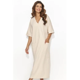 Tieto dlhé ležérne šaty s krátkymi rukávmi a výstrihom do V dokonale spájajú pohodlie s klasickou každodennou eleganciou. Šaty majú vpredu dve praktické vrecká a jedno z nich má navyše akcent zlatého pozlátenia, ktoré mu dodáva jemný lesk. Jednoduché a elegantné, tieto šaty sú dokonalou každodennou voľbou pre pohodlie a nadčasový štýl. Sú dostupné vo viacerých farbách, čo vám umožní prispôsobiť odtieň vašim osobným preferenciám. Vytvorte si s nimi univerzálny vzhľad na rôzne príležitosti. Je to odev, ktorý zvýrazní vašu osobnosť a dodá vám sebavedomie. Perfektne sa kombinujú s plochými sandálmi alebo espadrilkami.
