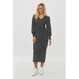 Tento šaty jsou skvělým příkladem elegance spojené s pohodlím. Model má jednoduchý, mírně přizpůsobený střih o střední délce, který zdůrazňuje siluetu a zároveň poskytuje pohodlí. Subtilní rozřez na zadní straně šatů neomezuje pohyb. Je vyroben z měkkého, pružného dresového materiálu, který dobře padne na těle, což ho činí ideálním na mnoho příležitostí. Výstřih je zakončen gumou ve tvaru písmene V, což šatě dodává subtilní eleganci a jemně zjemňuje krk. Dlouhé rukávy jsou zakončeny širokými gumami, což celkově dává šatům klasický vzhled. Rukávy mají mírné naběračky na ramenou, což šatům dodává moderní charakter. Taková kreace je ideální na každodenní vycházky, setkání s přáteli, nebo dokonce do práce, kde platí neformální dress code. Navíc model spojuje klasiku s nádechem modernosti, což z něj dělá všestranný kousek šatníku.