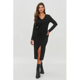 Dresové šaty jsou elegantní, ale zároveň jednoduchá nabídka na každý den, která kombinuje minimalismus s trochou stylu. Model má jednoduchý, přiléhající střih, který zdůrazňuje siluetu, ale zároveň zůstává pohodlný. Délka šatů sahá do poloviny lýtek, což jim dodává klasický charakter. Měkký a elastický materiál zajišťuje pohodlí nošení po celý den. Šaty mají dlouhé rukávy, ideální pro chladnější dny. Výstřih má tvar písmene V, který opticky prodlužuje krk a dodává eleganci. Na přední straně šatů se nachází subtilní rozštěp u spodu, který jim dodává lehkost a umožňuje volnost pohybu. Můžete je kombinovat s bílými teniskami, což dodá celkovému vzhledu sportovní, ale stále elegantní vzhled, nebo nosit s botkami nebo balerínami, aby se dosáhlo formálnějšího efektu. Tyto šaty jsou ideální volbou na každodenní vycházky, setkání s přáteli nebo do práce. Díky svému jednoduchému střihu a elegantním detailům se
