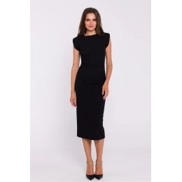 Tieto elegantné rúrkové šaty z elastického úpletu sú kvintesenciou minimalizmu a moderného štýlu. Strih bez rukávov v midi dĺžke krásne zvýrazňuje siluetu, zatiaľ čo záhyby na bokoch na úrovni pása dodávajú jemnú štruktúru a zoštíhľujú líniu tela. Na ramenách prinášajú jemné ramenné vypchávky geometrický nádych a dodávajú siluete výraznejší tvar. Šaty majú vzadu krytý zips a v spodnej časti diskrétny rozparok na pohodlné nosenie a voľnosť pohybu. Vďaka absencii podšívky sú šaty ľahké a pohodlné. Sú navrhnuté a ušité v Poľsku, čo zaručuje vysokú kvalitu a precízne spracovanie.