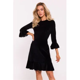 Krásne šaty z velúrového úpletu, ktoré spájajú pohodlie s elegantným štýlom. Strih v páse dokonale zvýrazňuje siluetu a výstrih dodáva klasický nádych. Dlhé 7/8 rukávy zakončené volánom dodávajú šatám jemný pôvab a dievčenský šarm. Spodná časť šiat, tiež zakončená volánom, prináša ľahkosť a pohyb a dĺžka po kolená je ideálna na rôzne príležitosti. Skrytý zips na chrbte zabezpečuje pohodlné zapínanie a vďaka absencii podšívky sú šaty ľahké a pohodlné na nosenie. Tieto šaty navrhnuté a vyrobené v Poľsku sú ideálnou voľbou pre ženy, ktoré ocenia kombináciu módneho vzhľadu a každodenného pohodlia.