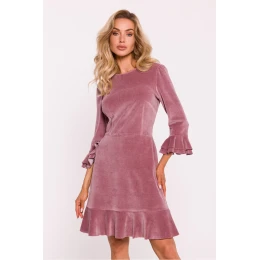 Krásne šaty z velúrového úpletu, ktoré spájajú pohodlie s elegantným štýlom. Strih v páse dokonale zvýrazňuje siluetu a výstrih dodáva klasický nádych. Dlhé 7/8 rukávy zakončené volánom dodávajú šatám jemný pôvab a dievčenský šarm. Spodná časť šiat, tiež zakončená volánom, prináša ľahkosť a pohyb a dĺžka po kolená je ideálna na rôzne príležitosti. Skrytý zips na chrbte zabezpečuje pohodlné zapínanie a vďaka absencii podšívky sú šaty ľahké a pohodlné na nosenie. Tieto šaty navrhnuté a vyrobené v Poľsku sú ideálnou voľbou pre ženy, ktoré ocenia kombináciu módneho vzhľadu a každodenného pohodlia.