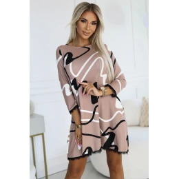 Pohodlné pletené trapézové šaty Numoco spájajú pohodlie a eleganciu. Sú vyrobené z elastickej pleteniny a majú béžovú potlač s čiernobielym vzorom. Model má praktické vrecká a jemné čierne čipkované lemovanie, ktoré dodáva stylingu ženský šarm. Ideálne na chladnejšie dni, spájajú funkčnosť s moderným dizajnom. poľský výrobok.