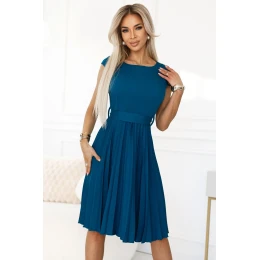 Lila sú elegantné a ženské šaty, ktoré očaria svojou ľahkosťou a klasickým strihom. Plisovaný materiál sa pri pohybe krásne skladá a opasok, ktorý sa dá zaviazať na mašľu, zvýrazňuje pás a dodáva postave pôvab. Krátke rukávy a skrytý zips zaručujú pohodlie a skvelé prispôsobenie. Výrazná morská farba priťahuje pozornosť a robí zo šiat ideálnu voľbu na rôzne príležitosti, od každodenných outfitov až po elegantné výlety.