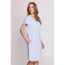 Šaty s uvoľneným strihom, ktorý zaručuje voľnosť pohybu a pohodlie počas celého dňa. Dĺžka po kolená robí z týchto šiat univerzálnu voľbu na mnohé príležitosti. Krátke rukávy dodávajú šatám ľahkosť a sú ideálne na teplé dni. Výstrih do V jemne zvýrazňuje krk a dodáva šatám ženský charakter. Skrytý zips na chrbte zaručuje jednoduché obliekanie a ďalšie rozparky v spodnej časti chrbta dodávajú šatám elegantný akcent. Šaty sú bez podšívky, vďaka čomu sú ešte vzdušnejšie a pohodlnejšie. Navrhnuté a ušité v Poľsku, čo zaručuje vysokú kvalitu spracovania a pozornosť venovanú detailom. Skvelá voľba pre ženy, ktoré oceňujú štýl, pohodlie a eleganciu vo svojom každodennom oblečení.