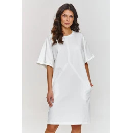 Šaty s krátkým rukávem jsou skvělou volbou pro ženy, které ocení jednoduchost a eleganci ve svých každodenních outfitcích. Jejich volný střih s lehkými detaily, jako jsou švy na přední straně, jí dodávají moderní a zároveň univerzální charakter. Široký rukáv sahající k lokti přináší volný, ležérní akcent a zároveň zůstává elegantní. Výstřih šatů má klasický, kulatý tvar, který decentně zdůrazňuje krk a zachovává jednoduchost outfitu. Kapsy na bocích jsou praktickým prvkem, který přidává funkcionalitu a zároveň zachovává minimalistický vzhled. Model má délku po kolena, což perfektně zdůrazňuje nohy a vytváří svěží, lehký vzhled. Šaty lze sladit s mnoha outfitovými styly a jsou skvělým pozadím pro módní doplňky. Můžete je zkombinovat s elegantními doplňky na večerní výstup nebo s ležérními na každý den. Díky jednoduchému, ale efektnímu střihu jsou ideální základ pro každý den, do práce, na setkání