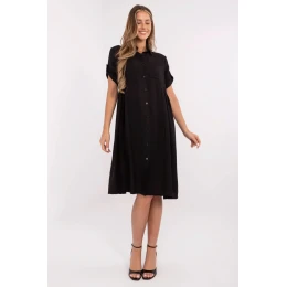 Rozšírené košeľové šaty v midi dĺžke, vytvorené s ohľadom na každodenné pohodlie a štýl. Sú vyrobené z ľahkej zmesi viskózy a nylonu, poskytujú priedušnosť a jemný lesk. Hladká tkanina zdôrazňuje ich všestranný charakter, ideálny do práce aj na neformálne stretnutia. Šaty majú klasický golier, krátke rukávy a zapínanie na gombíky. Ozdobné záhyby dodávajú šatám ženský pôvab a praktické náprsné vrecko rozbíja jednoduchý tvar. Skvelý dizajn na každú príležitosť, keď chcete vyzerať uvoľnene a zároveň elegantne.