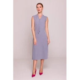 Objevte eleganci a pohodlí v jednom díle díky této jedinečné midi šaty. Navržená a ušitá v Polsku spojuje klasický styl s moderními detaily, ideální pro potřeby současné ženy. Šaty jsou vyrobeny z hladké, lehce elastické látky s saténovým povrchem, která se krásně přizpůsobuje postavě a zajišťuje pohodlí nošení. Její jednoduchý střih s lehce zdůrazněnou pasem a lehkým trapezovým tvarem zaručuje elegantní vzhled a volnost pohybu. Midi délka, sahající za koleno, jí dodává univerzální charakter. Výstřih ve tvaru písmene V s vázáním dole dodává šatičce jemnou smyslnost a umožňuje individuální přizpůsobení. Bez rukávů je to ideální volba na teplejší dny. Praktický rozpark na boku nejen usnadňuje pohyb, ale také přidává kreaci pikantní nádech. V pasu se nachází látkový pás s elegantní sponou, který dokonale zdůrazňuje pas. Šaty se zapínají pomocí skrytého zipu umístěného na straně, což zajišťuje snadné obléká