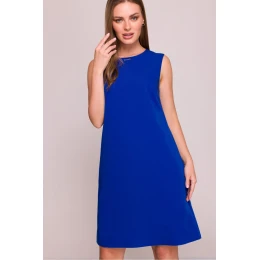 Elegantné šaty z hladkej, mierne elastickej tkaniny so saténovou úpravou, ktorá sa jemne leskne a dodáva celku jedinečný charakter. Model s okrúhlym výstrihom pod krkom zdobí kovový prvok, ktorý dodáva jemnú eleganciu. Šaty sú bez rukávov, zapínajú sa na skrytý zips na chrbte, ktorý zaručuje pohodlie pri nosení a minimalistický vzhľad. Strih je jednoduchý, lichobežníkový, voľný a neodhaľuje postavu, ideálny na každý deň a do kancelárie. Šaty majú podšívku, ktorá zvyšuje pohodlie a odolnosť oblečenia. Dĺžka pred kolená zdôrazňuje ženskú siluetu a zároveň poskytuje voľnosť pohybu. Navrhnuté a ušité v Poľsku.