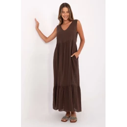 Tieto dlhé letné šaty so stupňovitým strihom sú ideálnou voľbou na každodenné teplé dni. Sú vyrobené z prírodnej bavlny, poskytujú priedušnosť a pohodlie aj v najväčších horúčavách. Široké ramienka a výstrih v tvare srdca jemne zvýrazňujú hornú časť postavy, zatiaľ čo voľne padajúci flitrový lem dodáva ľahkosť a ženský šarm. Šaty nemajú žiadne zapínanie, čo uľahčuje ich obliekanie a zaručuje pohodlie počas celého dňa. Hladký vzor je univerzálny a ľahko sa štylizuje a praktické vrecká na bokoch dodávajú funkčnosť. Je to nevyhnutná súčasť vášho letného šatníka, ideálna na prechádzky, nákupy alebo stretnutia vonku.