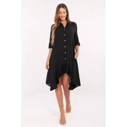 Tieto letné košeľové šaty s asymetrickým strihom sú štýlovou a pohodlnou ponukou na každý deň. Sú vyrobené z ľahkej, priedušnej bavlny a poskytujú pohodlie aj počas teplejších dní. Model má asymetrický predný diel a volánik na leme s jemnou výšivkou, ktorá celku dodáva jemný ženský nádych. Dĺžka pod kolená a voľnejší strih zaručujú, že šaty pôsobia uvoľnene a zároveň elegantne. Zapínanie na gombíky s klasickým golierom a 3/4 rukávmi s možnosťou vyhrnutia uľahčuje prispôsobenie sa štýlu a počasiu. Ďalšou výhodou sú praktické vrecká ukryté v bočných švoch. Sú ideálne na každodenné vychádzky a spájajú funkčnosť s moderným vzhľadom.