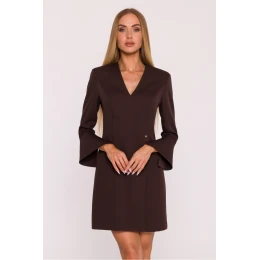 Elegantní šaty ušité z hladké látky s matným finišem jsou ideální volbou pro ženy, které ocení jednoduchost a moderní styl. Lehce těsněný střih jemně zdůrazňuje postavu, zůstávající volný směrem dolů. Model má výstřih ve tvaru písmene V, který krásně zjemňuje krk a dodává lehkost. Rukávy délky 7/8, jemně rozšířené dole, přinášejí jemný, vzdušný akcent. Šaty se zapínají vzadu na skrytý zip, co zajišťuje pohodlí a estetické provedení. Pas je navíc zdůrazněn kovovou značkou, která dodává celku decentní, elegantní charakter. Chybějící kapsy a minimalistický design zdůrazňují moderní, ženský styl šatů. Mini délka dodává mladistvý výraz a zdůrazňuje nohy. Navrženo a ušito v Polsku, vytvořeno pro ženy, které ocení klasiku s decentním, moderním akcentem.