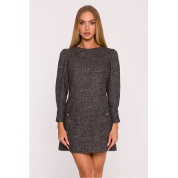 Elegantní šaty z tkaniny tweed v melírovaném vzoru jsou návrhem, který spojuje klasický šarm s dívčí grácií. Strukturální materiál se krásně skládá na postavě a jeho charakteristická faktura dodává celku výrazný styl. Model s výstřihem ve tvaru lodičky a dlouhými rukávy se sbíhavými rameny vypadá decentně a žensky. Švy na spodních koncích rukávů jim dodávají elegantní tvar a skrytý zip vzadu zajišťuje pohodlí a estetické provedení. Na přední straně jsou našity kapsy zdobené bižuterními mašlemi, které prolomují klasickou linii střihu a vnáší efektní, dekorativní akcent. Trapézový střih, jemně přizpůsobený v ramenou a volný v bocích, zaručuje pohodlí nošení a krásnou, harmonickou postavu. Mini délka dodává šatům lehkost a moderní charakter. Navrženo a ušito v Polsku, ideální pro ženy, které ocení eleganci s nádechem originálních detailů.