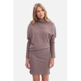 Šaty jsou vyrobeny z vysoce kvalitního pruhovaného pleteného materiálu o hmotnosti 250 g, který krásně padne na postavu a poskytuje pohodlí při nošení. Model se obléká přes hlavu, bez kapes a podšívky, díky čemuž zůstává lehký a pohodlný. Vysoký límec s měkkým polstrováním jí dodává výjimečný charakter a jemně obklopuje krk. Dlouhé, netopýří rukávy se zužují ke dnu, vytvářejí efektní linii ramen a volnější horní část ve spojení s přiléhavým, tužším spodkem dává šatům bluzový střih, který zdůrazňuje pas a zjemňuje postavu. Mini délka, sahající před kolena, dělá šaty ideální kombinací elegance s ženskou lehkostí. Navrženo a ušito v Polsku z pleteniny vyrobené v Lodži, je to nabídka pro ženy, které ocení místní řemesla, vysokou kvalitu a nadčasový styl.